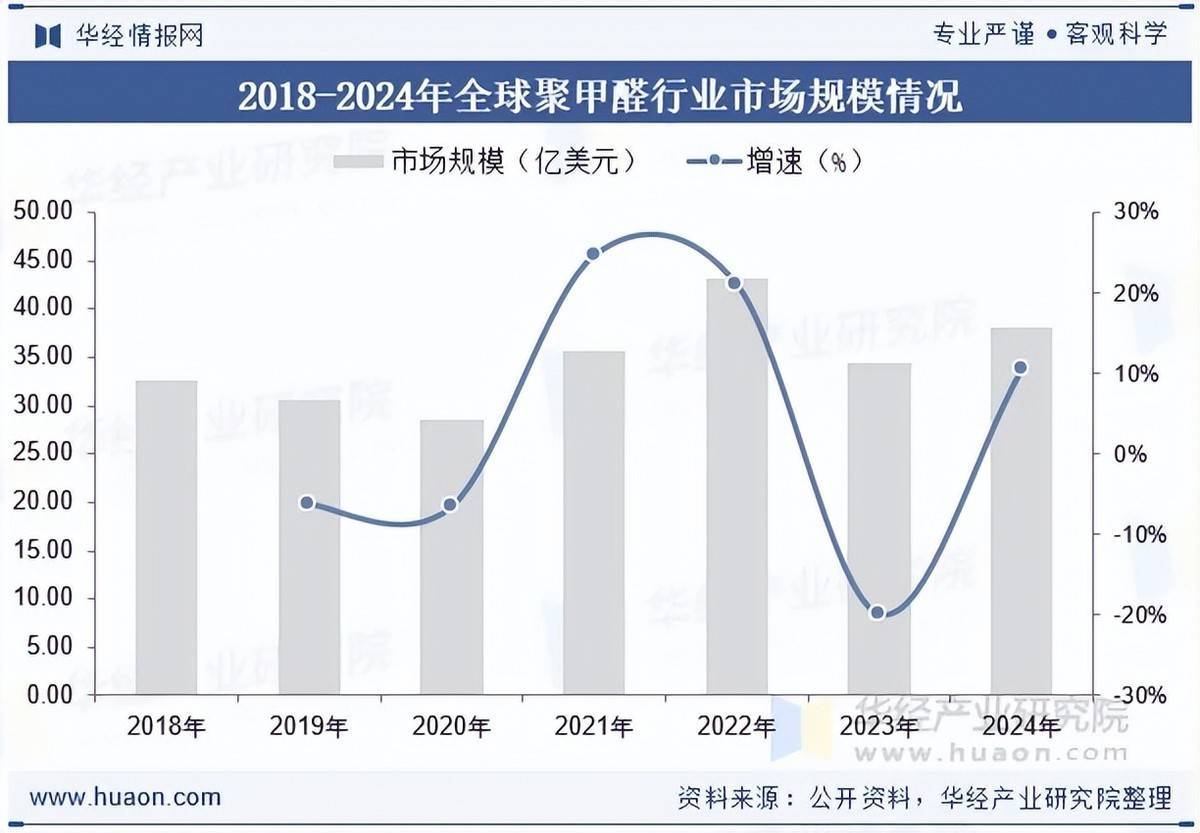 近二十多年来,国外聚甲醛行业一直处于稳步发展的阶段,供需基本处于平衡状态。世界聚甲醛的生产主要集中在美国、日本、德国、荷兰、韩国和中国。市场规模来看,据统计,截至2024年全球聚甲醛行业市场规模为38.19亿美元,同比增长10.6%。